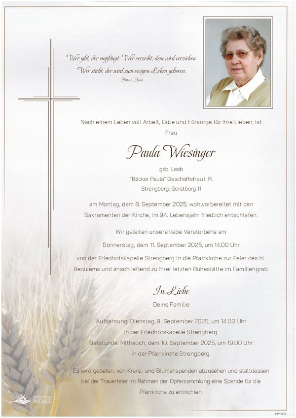 Paula Wiesingerverstorben am 08. September 2025 Beerdigung in Strengberg |