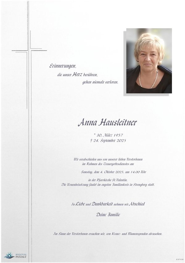 Anna Hausleitnerverstorben am 24. September 2025 Begräbnis in St. Valentin |