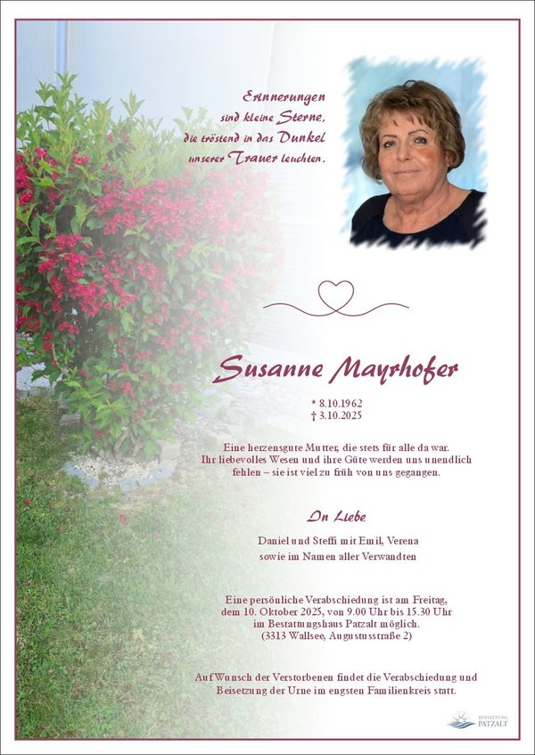 Susanne Mayrhoferverstorben am 03. Oktober 2025 Beisetzung in Oed |