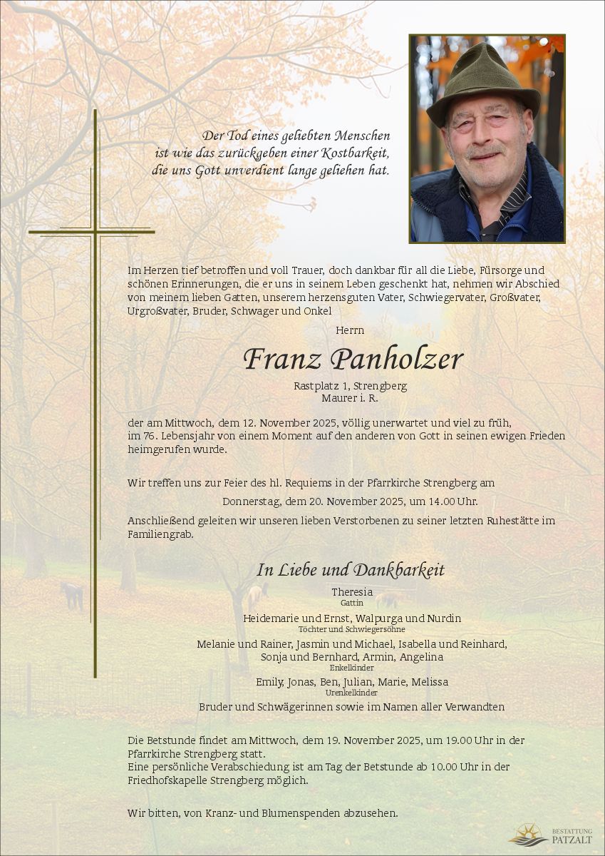 Franz Panholzerverstorben am 13. November 2025 Begräbnis in Strengberg |