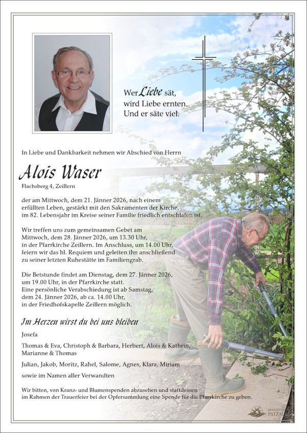 Alois Waserverstorben am 21. Jänner 2026 Beerdigung in Zeillern |