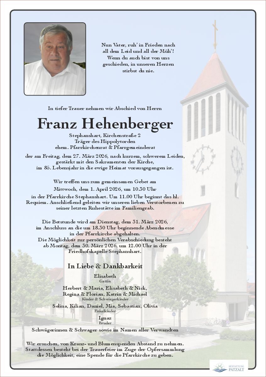 Franz Hehenbergerverstorben am 27. März 2026 Beerdigung in Stephanshart |