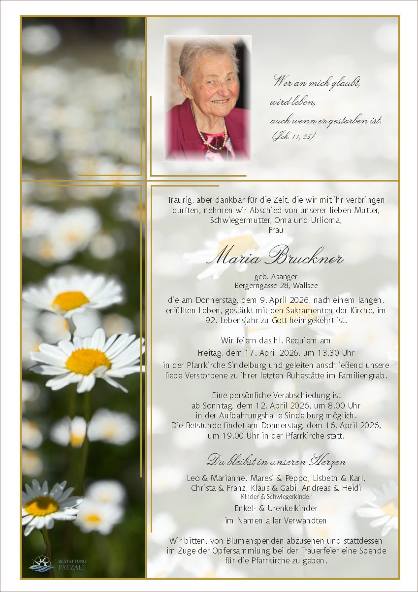 Maria Brucknerverstorben am 09. April 2026 Begräbnis in Sindelburg |