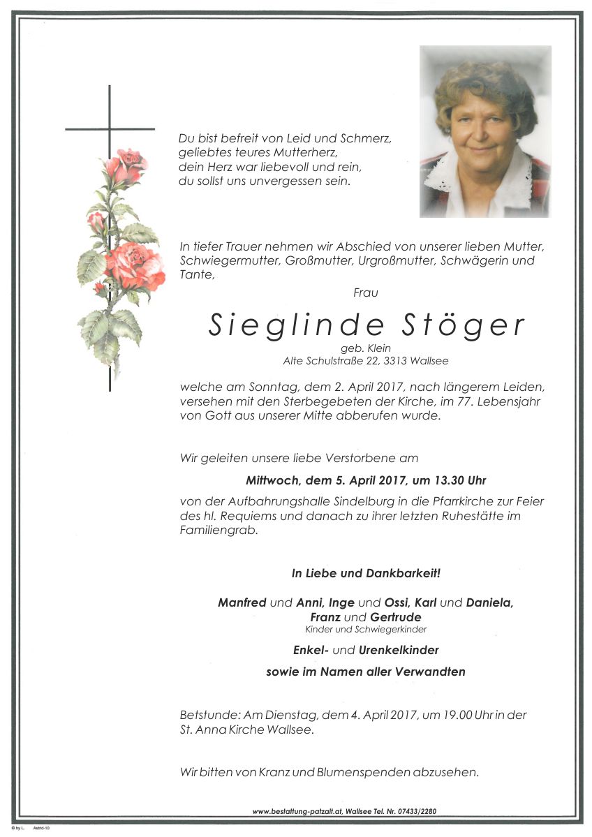 Sieglinde Stögerverstorben am 02. April 2017 wohnhaft in Wallsee-Sindelburg Beerdigung in Sindelburg |