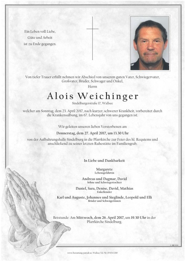 Alois Weichingerverstorben am 23. April 2017 wohnhaft in Wallsee-Sindelburg Beerdigung in Sindelburg |