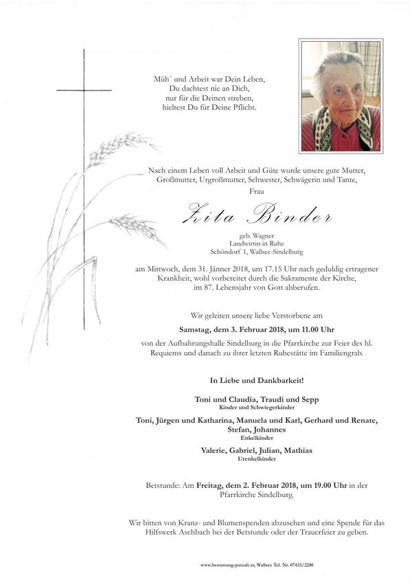 Zita Binderverstorben am 31. Jänner 2018 wohnhaft in Wallsee-Sindelburg Beerdigung in Sindelburg |