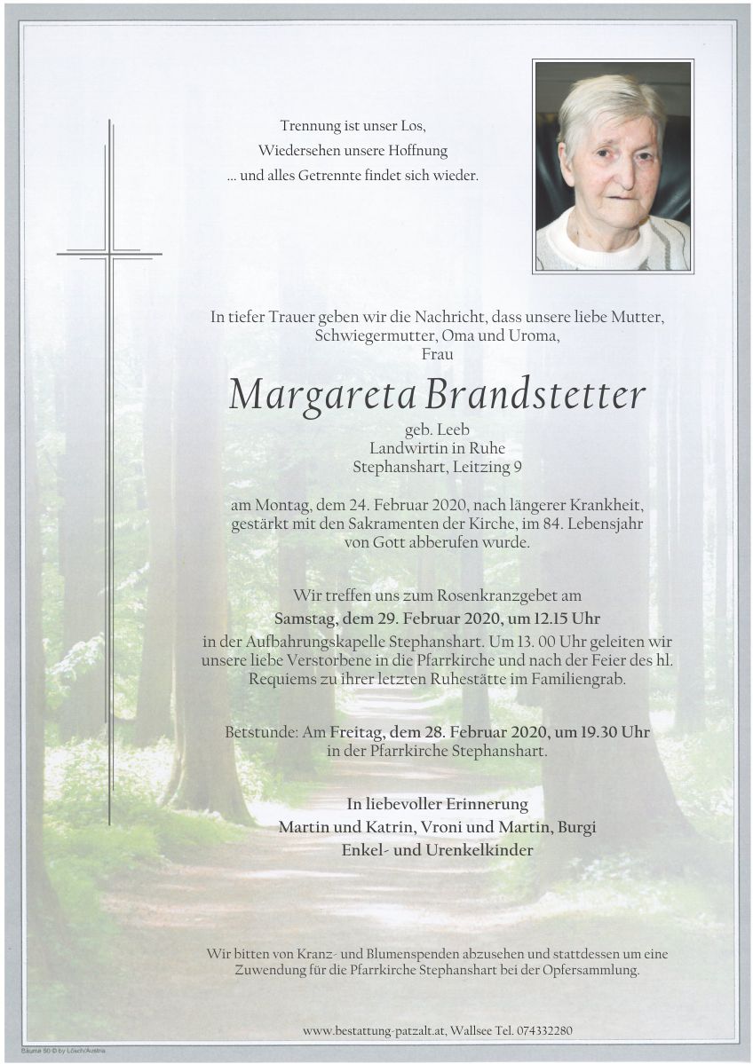 Margareta Brandstetterverstorben am 24. Februar 2020 Beerdigung in Stephanshart |