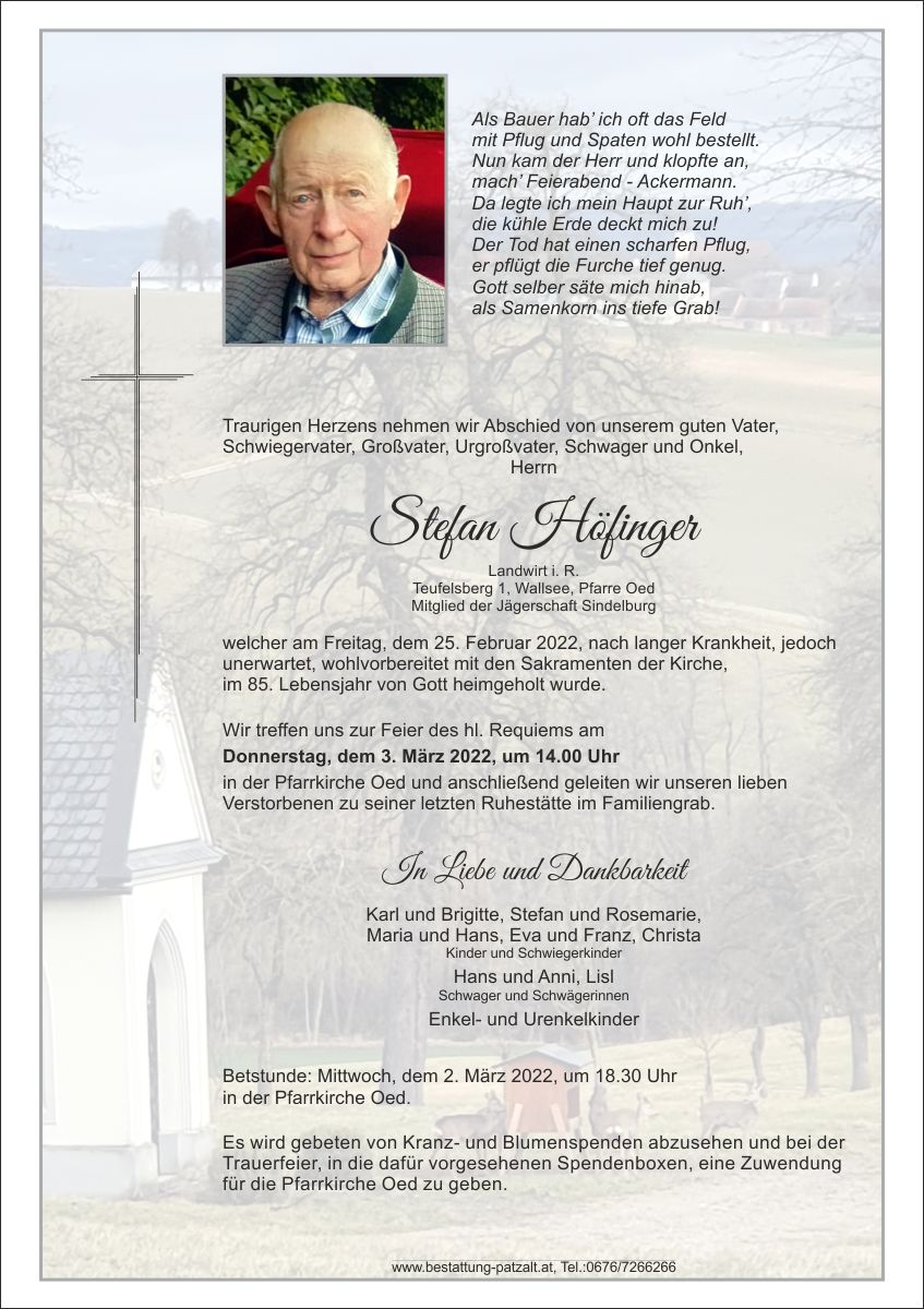 Stefan Höfingerverstorben am 25. Februar 2022 Beerdigung in Oed |