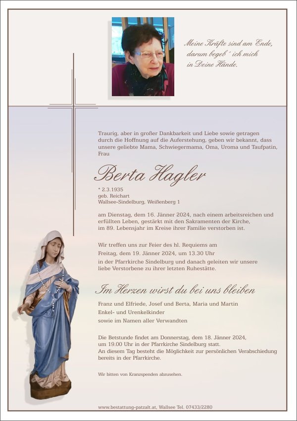 Berta Haglerverstorben am 16. Jänner 2024 Beerdigung in Sindelburg |