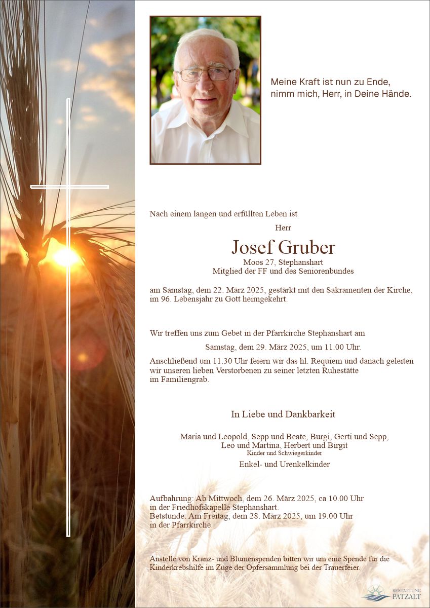 Josef Gruberverstorben am 22. März 2025 Beerdigung in Stephanshart |