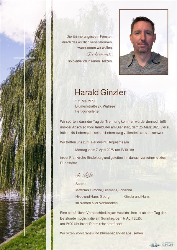 Harald Ginzlerverstorben am 25. März 2025 Begräbnis in Sindelburg |