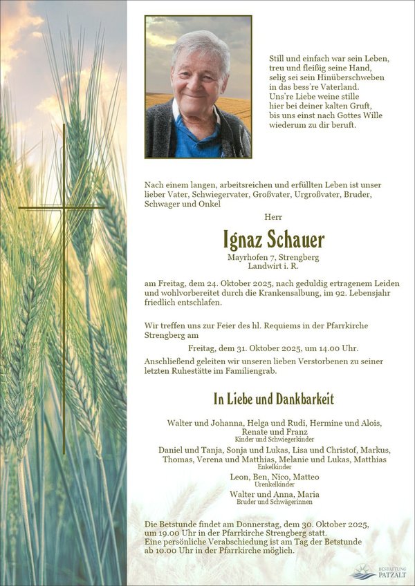 Ignaz Schauerverstorben am 24. Oktober 2025 Begräbnis in Strengberg |