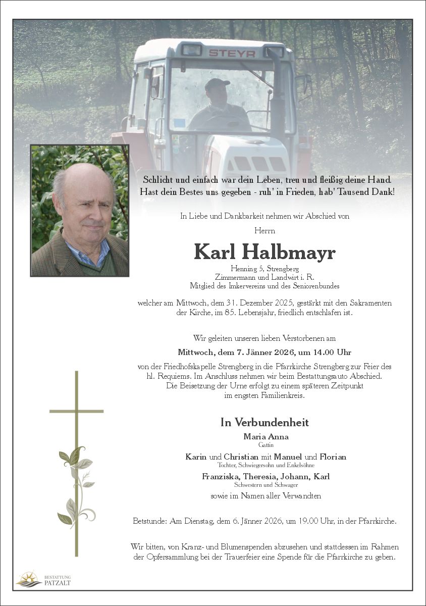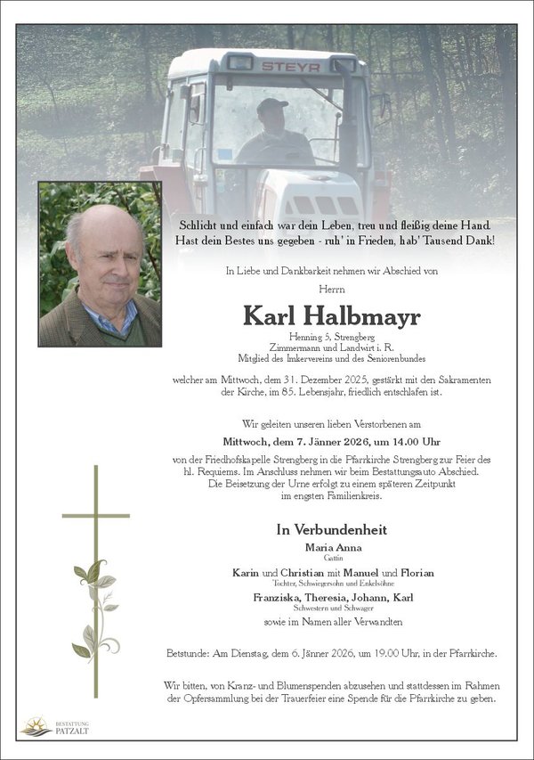 Karl Halbmayrverstorben am 31. Dezember 2025 Begräbnis in Strengberg Aufbahrung 1.1.2026, 13.00 Uhr in der Friedhofskapelle Strengberg |
