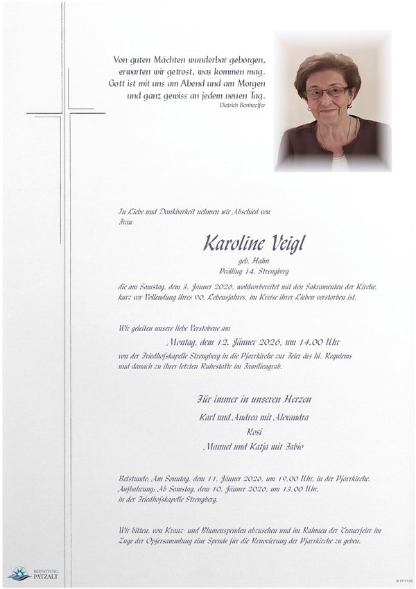Karoline Veiglverstorben am 03. Jänner 2026 Begräbnis in Strengberg |