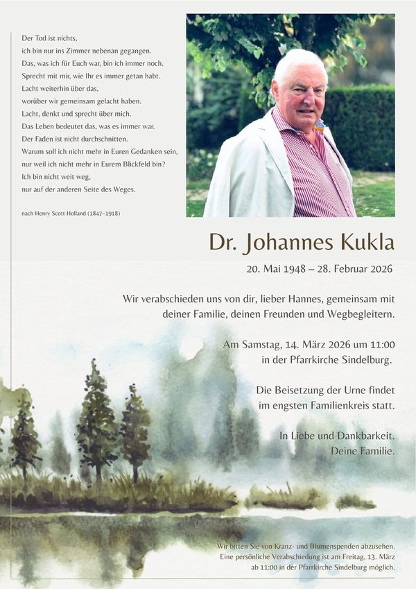 Dr. Johannes Kuklaverstorben am 28. Februar 2026 Begräbnis in Sindelburg |