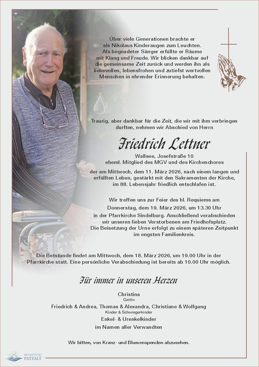 Maria Schaub am 19.03.2026Der Trauerfamilie mein herzliches Beileid! Heinz und Margareta Dirnberger am 19.03.2026Unser herzliches Beileid! Pfaffeneder Maria und Franz am 19.03.2026Der Trauerfamilie unser aufrichtiges Beileid! Manuela Michlmayer am 19.03.2026Mein aufrichtiges Beileid Sabine Ginzler am 19.03.2026Mein herzliches Beileid. Korner Johann und Juliana am 19.03.2026Unsere aufrichtige Anteilnahme! Gertraud Steinböck und Franz Gruber am 19.03.2026Ruhe in Frieden Fritz unser herziches Beileid der Trauerfamilie Michaela und Christoph Einheller am 19.03.2026Unsere aufrichtige Anteilnahme der gesamten Trauerfamilie Waltraud Ortner am 19.03.2026Aufrichtige Anteilnahme Claudia und Wolfgang Sallinger am 18.03.2026Aufrichtiges Beileid. Ruhe in Frieden, lieber Herr Lettner Brigitte Haydter am 18.03.2026Mein aufrichtiges Beileid! Familie Höfinger (Zehethof) am 18.03.2026Unsere aufrichtige Anteilnahme! Riesenhuber Wolfgang und Sylvia am 18.03.2026Unser aufrichtiges Beileid der gesamten Familie. Es tut uns sehr leid. Margarethe Ornazeder am 18.03.2026Ein aufrichtiges Beileid Karin Jaksch am 18.03.2026Mein aufrichtiges Beileid Hanni Lukas (Schwinghammer) am 18.03.2026Mein aufrichtiges Beileid der ganzen Familie! Lukas Rumetshofer am 18.03.2026Mein aufrichtiges Beilad der ganzen Familie! Jürgen und Sabine Mistlberger am 18.03.2026Unser aufrichtiges Beileid der gesamten Familie ! Alfred Kloibhofer am 18.03.2026Mein aufrichtiges Beileid der ganzen Trauerfamilie. Johanna und Leopold Lampersberger am 18.03.2026Unser aufrichtiges Beileid Fam. Andreas und Sigrid Lanzinger am 18.03.2026Ruhe in Frieden ! Fam. Markus Hintersteiner und Anita Ebner am 18.03.2026Unsere aufrichtige Anteilnahme der gesamten Trauerfamilie! Viel Kraft für die kommende Zeit! Franz und Brigitte Wiesinger am 18.03.2026Unser aufrichtiges Beileid der gesamten Trauerfamilie! Edi und Traudi Pilsinger am 18.03.2026Aufrichtige Anteilnahme der ganzen Familie Gerti Hintersteiner am 18.03.2026Meine aufrichtige Anteilnahme der ganzen Trauerfamilie. Waltraud Sengstbratl am 18.03.2026Mein aufrichtiges Beileid. Ruhe in Frieden Familie Weitzenböck Amstetten am 17.03.2026Unsere aufrichtige Anteilnahme! Pfaffeneder Martin und Renate am 17.03.2026Danke Fritz für die schönen gemeinsamen Jahre beim MGV. Der Trauerfamilie unsere aufrichtige Anteilnahme. Familie Bettina und Harald Gruber am 17.03.2026Aufrichtiges Beileid der gesamten Trauerfamilie! Ruhe in Frieden, Herr Lettner! Gudrun und Hans Schoder in Berg am 17.03.2026Aufrichtige Anteilnahme. Manuel und Nicole Ziervogl am 17.03.2026Unser aufrichtiges Beileid! Eva Illich am 17.03.2026Ruhe in Frieden lieber Herr Lettner. Mein Beileid der Familie. Hannes und Gusti Lammerhuber am 17.03.2026Aufrichtiges Beileid! Ruhe in Frieden! Lothar und Ingeborg Sekyra am 17.03.2026Aufrichtige Anteilnahme der Familie. Pfiat di mein Sangesbruder und gute Reise. Bettina und Martin Zarl am 17.03.2026Der Trauerfamilie unser aufrichtiges Beileid! Fam. Rosenberger Windpassing am 17.03.2026Aufrichtige Anteilnahme! Wagner Christl Strengberg am 17.03.2026Ein Stückerl liebenswertes Wallsee gibt es nicht mehr..Es war immer schön ihn.zu treffen.Der Herr Lettner hatte immer ein Lächeln im Gesicht und auch immer nette Worte. Ein Mensch der sicher fehlt.Eine schöne Reise.Der Familie meine Anteilnahme. Walter und Hermi Pampalk am 16.03.2026Unser herzliches Beileid ! Brigitte und Hans Schoder am 16.03.2026Unsere aufrichtige Anteilnahme Andreas und Gertrude Pfleger am 16.03.2026Unsere aufrichtige Anteilnahme Karl Hiesberger am 16.03.2026Meine aufrichtige Anteilnahme ! Reinhard und Edith Furtlehner am 16.03.2026Da, wo du bist wird Gesang sein und Klang. Möge das Licht dich begleiten auf deiner letzten Reise. Ilse und Herbert Schmutz am 16.03.2026Unser aufrichtiges Beileid! Martin und Monika Lanzinger am 16.03.2026Aufrichtige Anteilnahme der ganzen Familie! Wir werden uns immer gerne an dich erinnern. Familie Gruber Franz Wallsee am 16.03.2026Unsere Aufrichige Anteilnahme! Margit und Rudi Froschauer am 16.03.2026Ruhe in Frieden Walter und Annemarie Pachlehner am 16.03.2026Unsere aufrichtige Anteilnahme! Stefan Weidinger am 16.03.2026Mein aufrichtiges Beileid Rupert Stadler, Strengberg am 16.03.2026Mein aufrichtiges (Sänger) Beileid R.I.P. Fam. Birgit u. Gerhard Neulinger am 16.03.2026Unser aufrichtiges Beileid! Daurer Maria Preinesberg am 16.03.2026Herzliches Beileid der ganzen Trauerfamilie! Monika Hiesberger am 16.03.2026Mein aufrichtiges Mitgefühl den Hinterbliebenen und lieber Fritz ein danke schön für deine Freundlichkeit Schönlechner Franz am 16.03.2026Mein aufrichtiges Beileid - ruhe in Frieden lieber Letti Opa. Fam. Hans und Resi Wieser am 16.03.2026Unser aufrichtiges Beileid. Eva Patzalt am 16.03.2026Mein aufrichtiges Mitgefühl der gesamten Trauerfamilie. Herr Lettner wird mir immer in Erinnerung bleiben, er war der freundlichste und herzlichste Mensch den ich kannte. Hausberger Fritz und Elfi am 16.03.2026Unser aufrichtiges Beileid Haydter Josef und Theresia am 16.03.2026Unser aufrichtiges Beileid! Kirchweger Christine, Parlamentwirt am 16.03.2026Lieber Herr Lettner, du warst oft Gast bei uns in der Mittagspause und wenn du dann nur mit deinen Händen ohne Instrument die Trompete gespielt hast, dann habe ich als Kind immer ganz verstohlen die Tür zur Gaststube aufgemacht und zugehört, das werde ich nie vergessen. Als ich dann selber Kellnerin war, habe ich dich als freundlichen, liebenswerten Gast kennenglernt und werde dich auch so in Erinnerung behalten. Pfiat di! Mein Beileid der Familie. Philipp Klem am 16.03.2026Aufrichtige Anteilnahme! Pfleger Gabi am 15.03.2026Mit grosser Traurigkeit nehmen wir Abschied ,von einem besonderen Menschen ! Fritz du warst ein Mensch ,der immer aufmerksam für die anderen da war ,fleissig bis ins hohe Alter ! Deine Liebe zur Natur und die Fürsorge war bewundernswert ! Mit Deiner ruhigen Art und Deinen unermüdlichen Einsatz sei es als Nikolaus ,beim Kirchenchor und Män